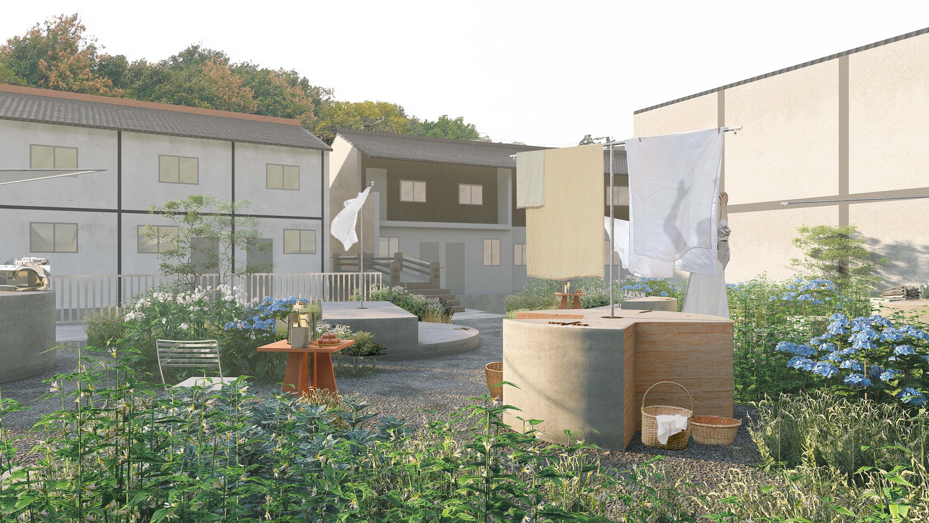 晒太阳:院落转为花园,圆形晾晒台承载生活所需,绿意共享闲适。