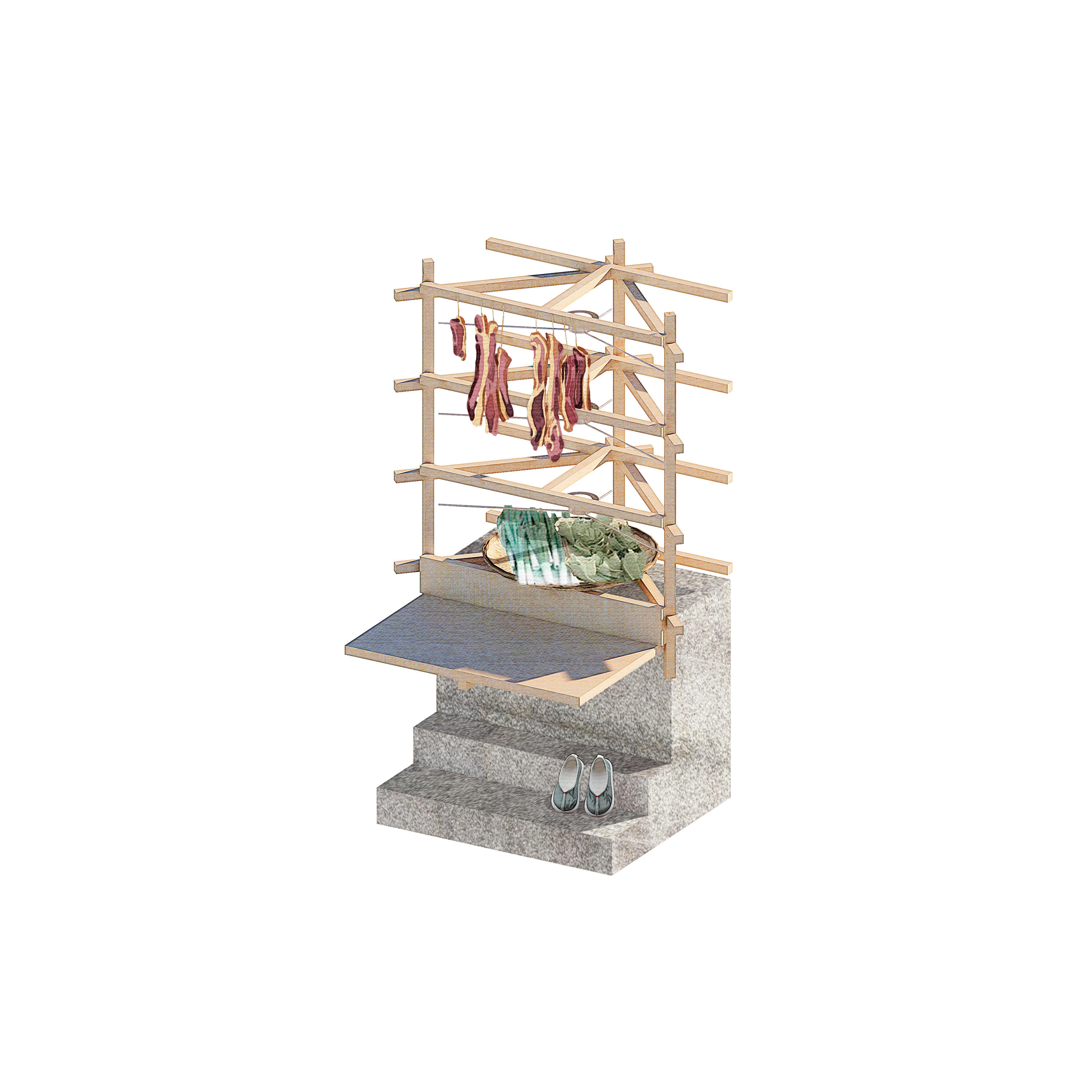 Basking in Life: Dried mustard greens and rice cakes are sun-dried at the Mofang Bridge, while a